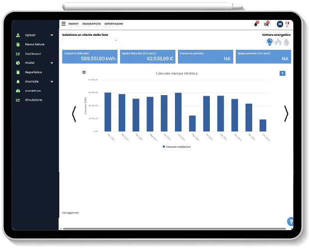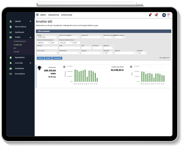 Mettiamo pertanto a disposizione una soluzione in Cloud che permette di digitalizzare le bollette energetiche e verificarne in modo puntuale la correttezza, analizza i dati di consumo e permette di generare report sintetici, dettagliati e personalizzati per avere una visione completa e andamentale dei costi, consumi e dati di performance.