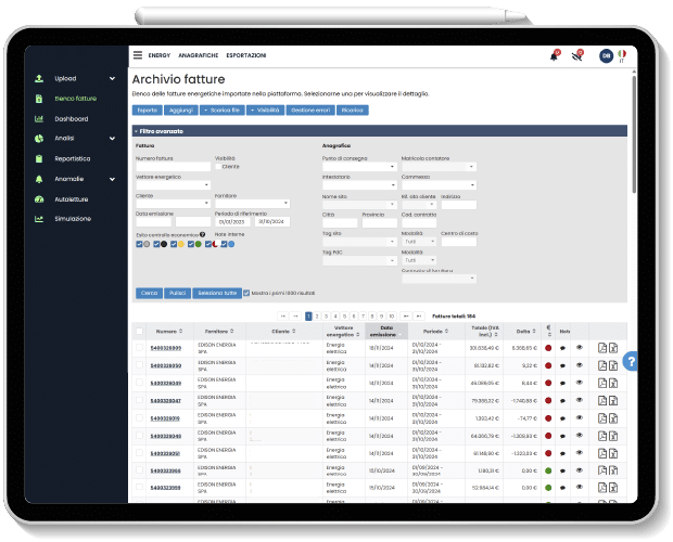 - Digitalizzazione delle bollette: è possibile digitalizzare automaticamente le fatture energetiche a partire dai PDF dei fornitori.